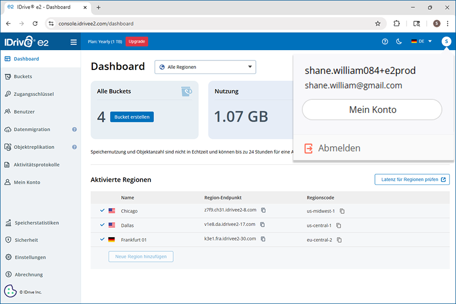 IDrive® e2 ist eine webbasierte Konsole, mit der Sie auf Ihre Daten zugreifen, Speicher und Benutzer überwachen, Kontoeinstellungen verwalten usw. können.