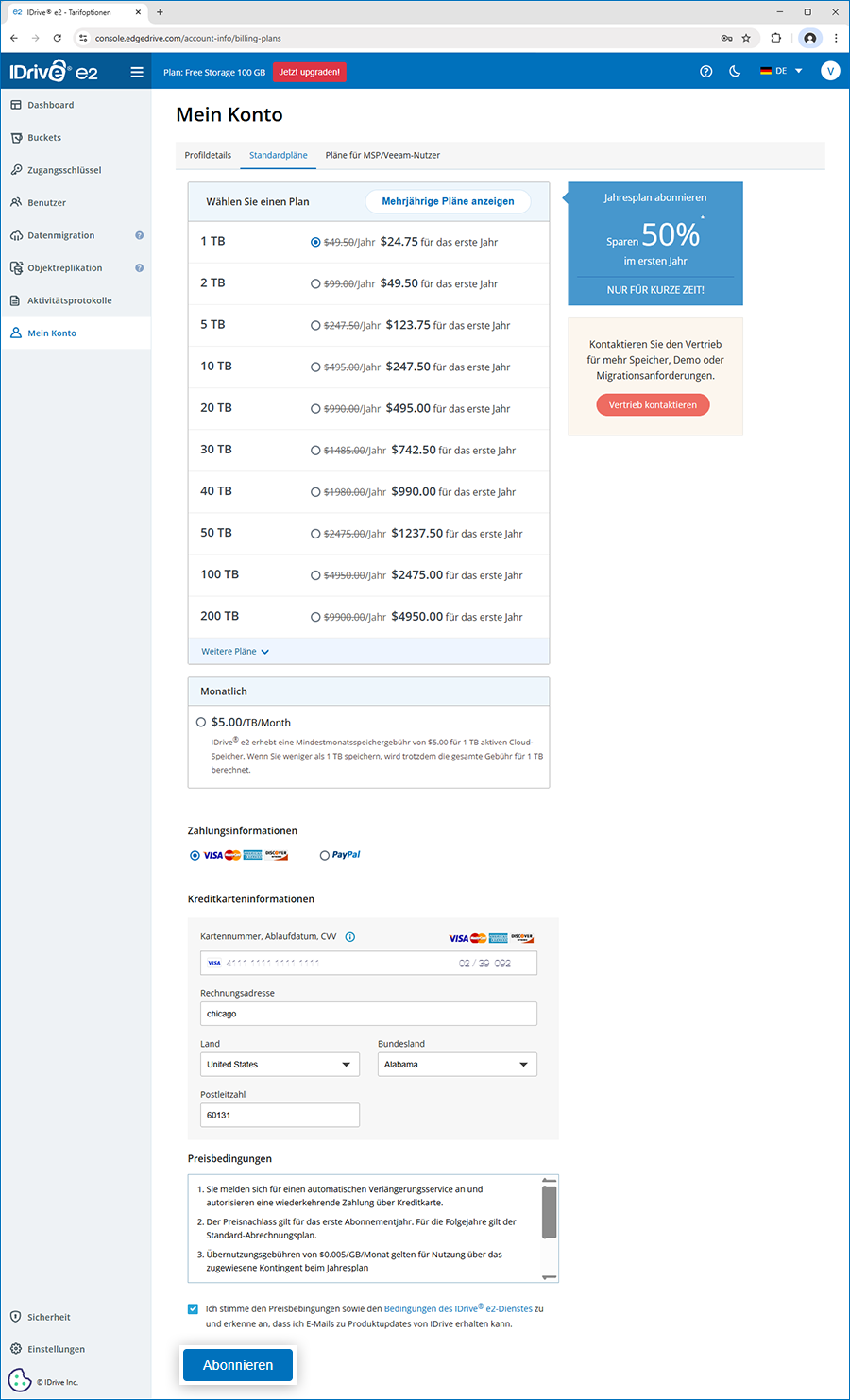 IDrive® e2 berechnet die Servicegebühr basierend auf der Menge des aktiven Speichers, der während des Abrechnungszeitraums genutzt wird. Es fallen keine zusätzlichen Gebühren für Ingress, Egress, Datenlöschung und API-Anfragen an.