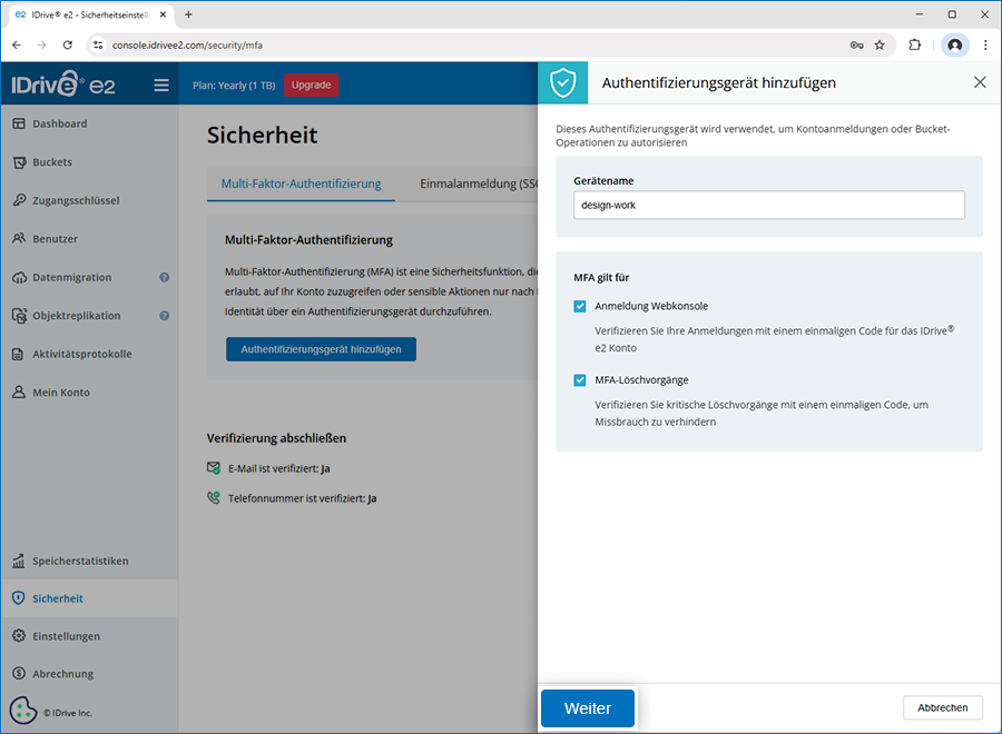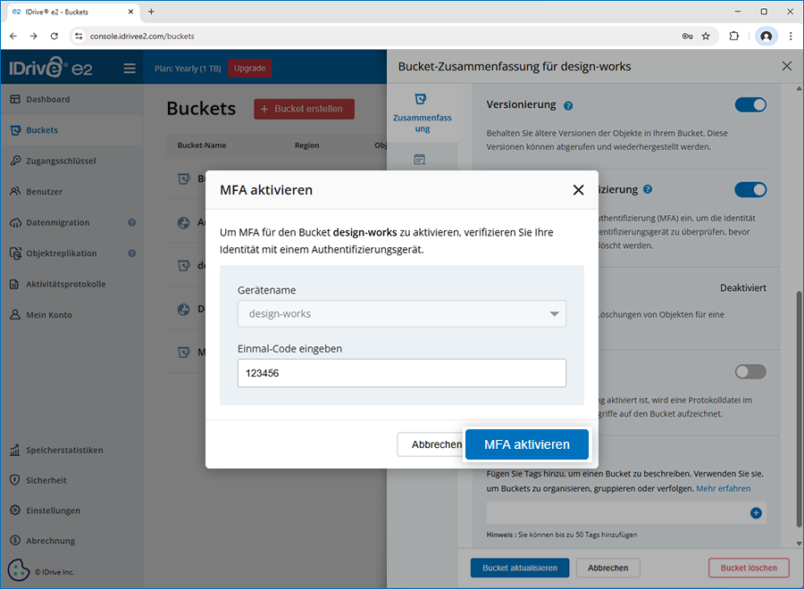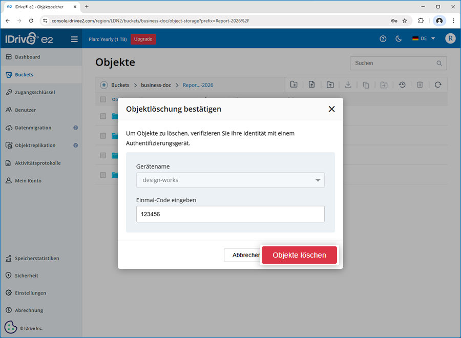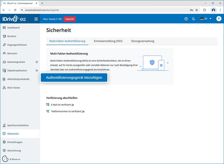 Mit aktivierter MFA sind Aktionen wie das Anmelden oder Löschen von Objekten in IDrive® e2 besser geschützt, sodass Sie Ihre Daten mit mehr Sicherheit und Kontrolle verwalten können. MFA stärkt die Kontosicherheit und reduziert das Risiko unbefugten Zugriffs erheblich.