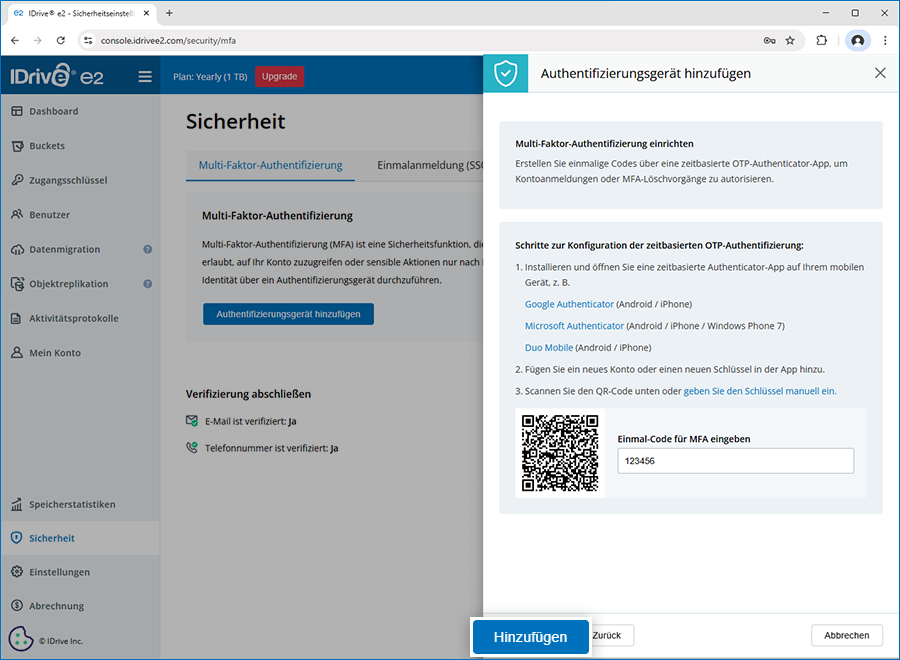 Um MFA zu aktivieren, fügen Sie zunächst ein Authentifizierungsgerät zu Ihrem Konto hinzu. Nach dem Hinzufügen kann MFA für Anmeldung und das Löschen von Objekten und Buckets verwendet werden.