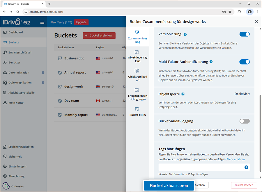 - Im Übersicht-Abschnitt aktivieren Sie Multi-Faktor-Authentifizierung und klicken Sie auf Bucket aktualisieren.