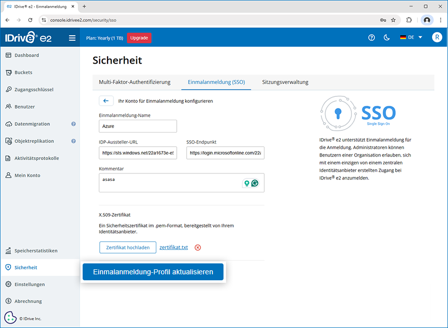 - Single Sign-On URL: https://api.idrivee2.com/api/sso/samlassert
