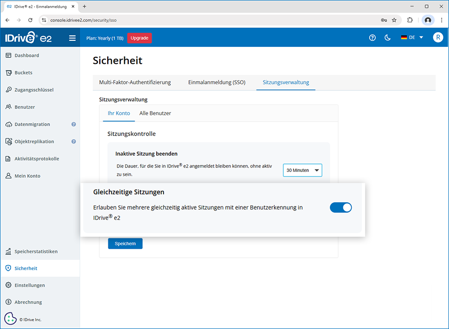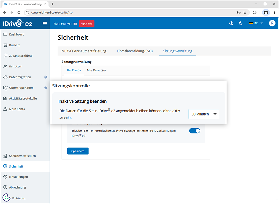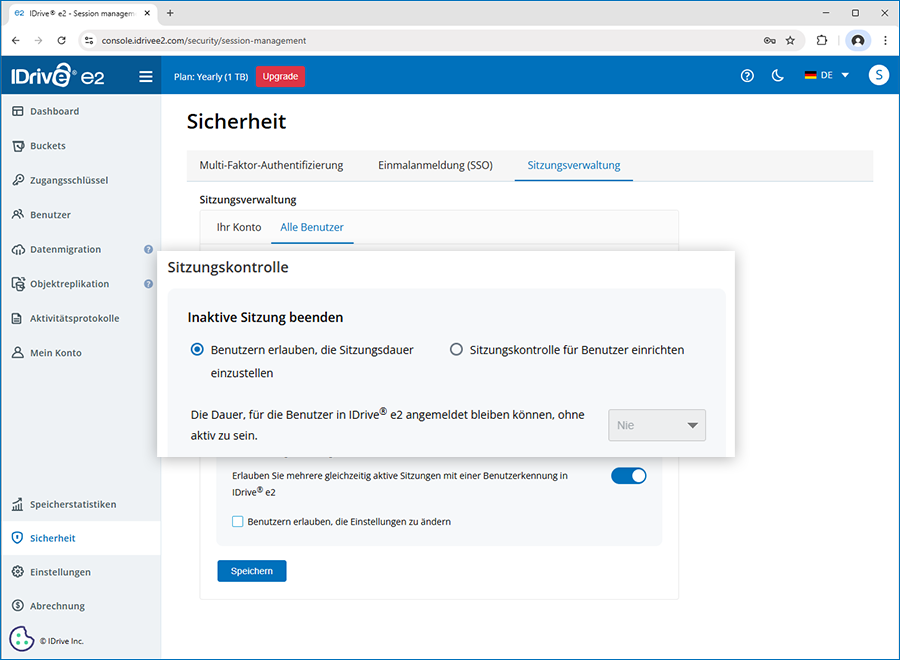 Ja, Sie können eine Zeitüberschreitung für inaktive Sitzungen festlegen, um das automatische Abmelden von IDrive® e2 zu erzwingen, wenn Benutzer für die angegebene Dauer inaktiv sind.
