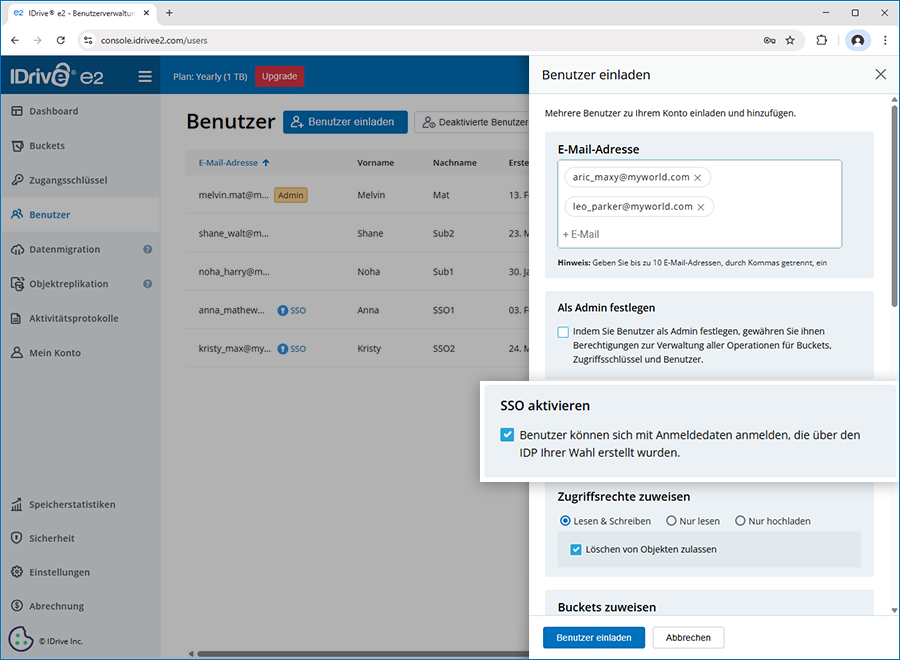 Der Administrator des IDrive® e2 Kontos kann SSO beim Einladen von Benutzern aktivieren. Alternativ kann der Administrator SSO auch für bestehende Benutzer aktivieren.