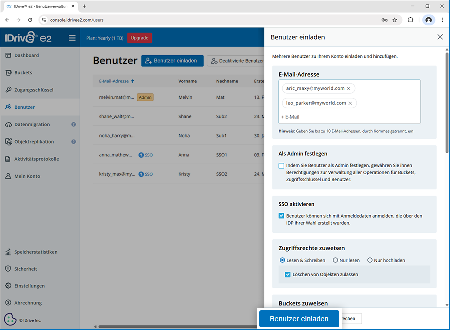 Hinweis: Eine Einladung wird an diese E-Mail-Adressen zum Erstellen eines Kontos gesendet. - Aktivieren Sie das Kontrollkästchen 'Als Administrator festlegen', um Benutzern Administratorrechte zu gewähren. Alle Benutzer mit Administratorrechten können Buckets, Zugriffsschlüssel und Benutzer verwalten.