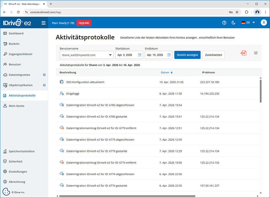 Ja, Sie können die Aktivitätsprotokolle Ihres IDrive® e2-Kontos im Tab Aktivitätsprotokolle einsehen. Es werden Informationen wie Aktivität, Datum, Uhrzeit und IP-Adresse angezeigt.