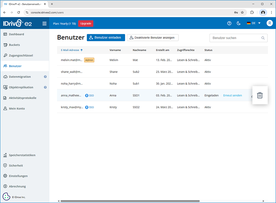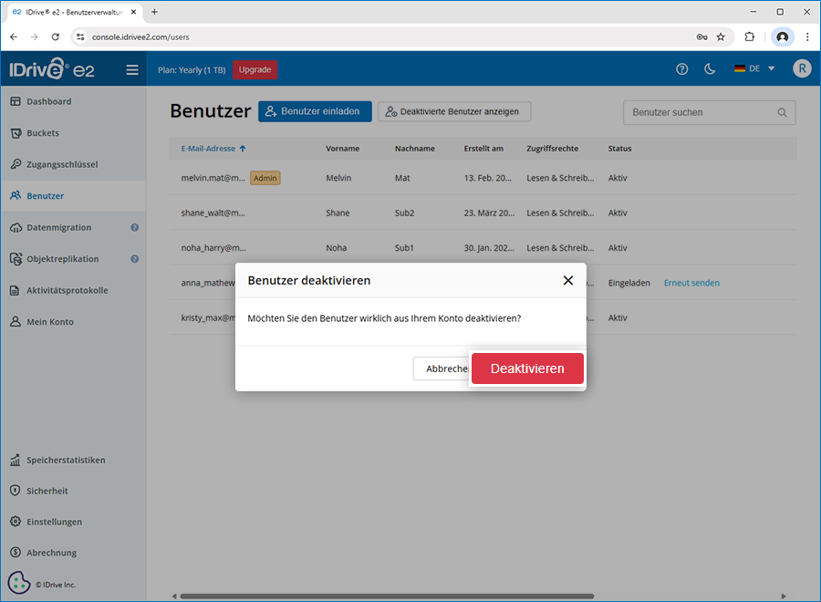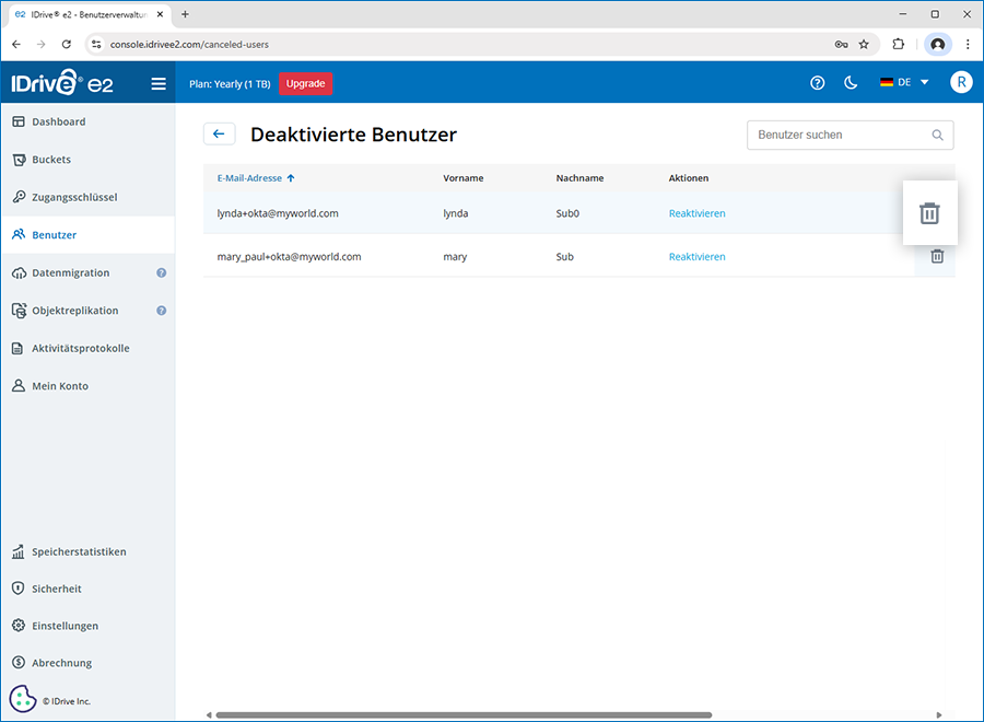 Durch das Löschen eines Benutzerkontos wird dessen Konto gekündigt und der Benutzer kann sich nicht mehr bei seinem IDrive® e2-Konto anmelden.