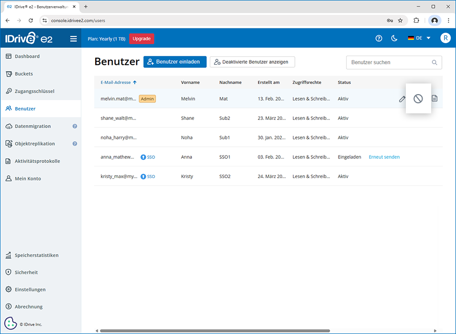 Ja, Sie können einen aktiven Benutzer deaktivieren und ihm den Zugriff auf sein IDrive® e2-Konto verwehren.