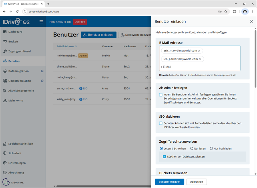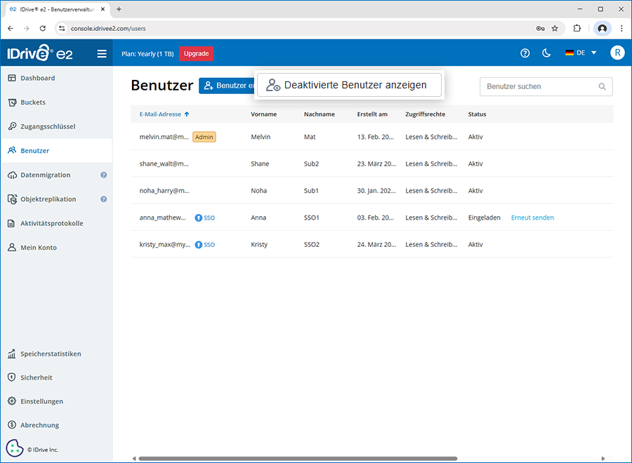 - Melden Sie sich beim IDrive® e2-Konto an und wechseln Sie zum Tab Benutzer.