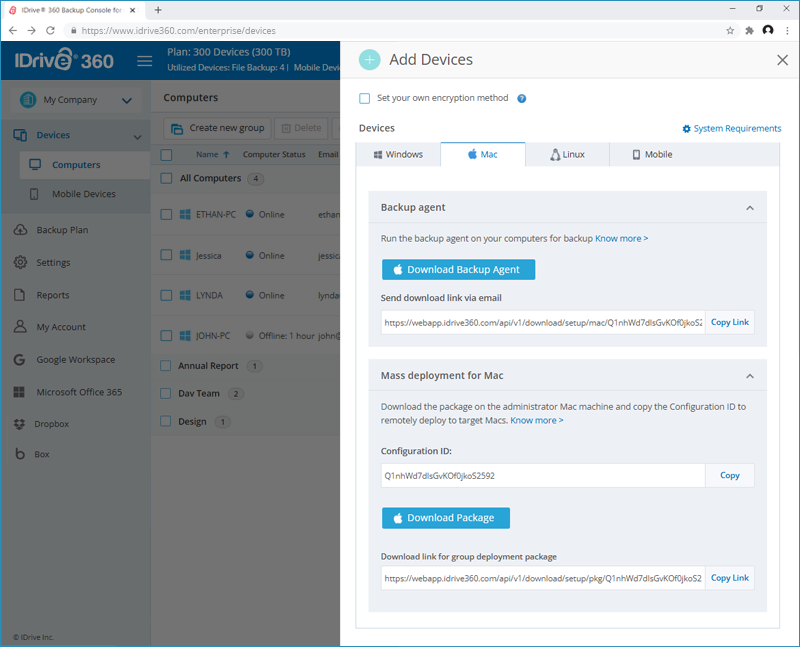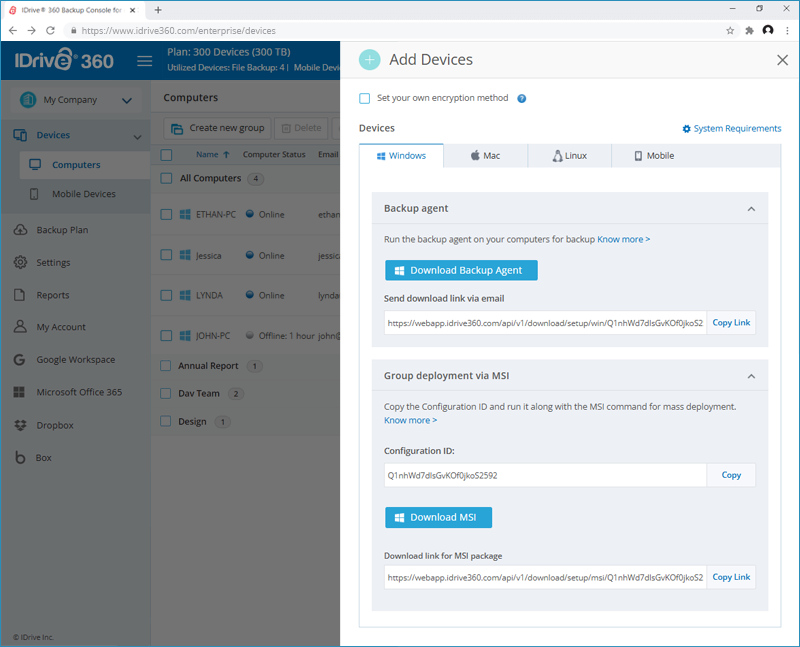 To add computers through mass deployment, copy the Configuration ID applicable for your account and click the ‘Download MSI’ button to download the IDrive 360 MSI file for Windows or click the 'Download Package' button to download the IDrive 360 mass deployment package file for Mac. Read the following steps to know more about: