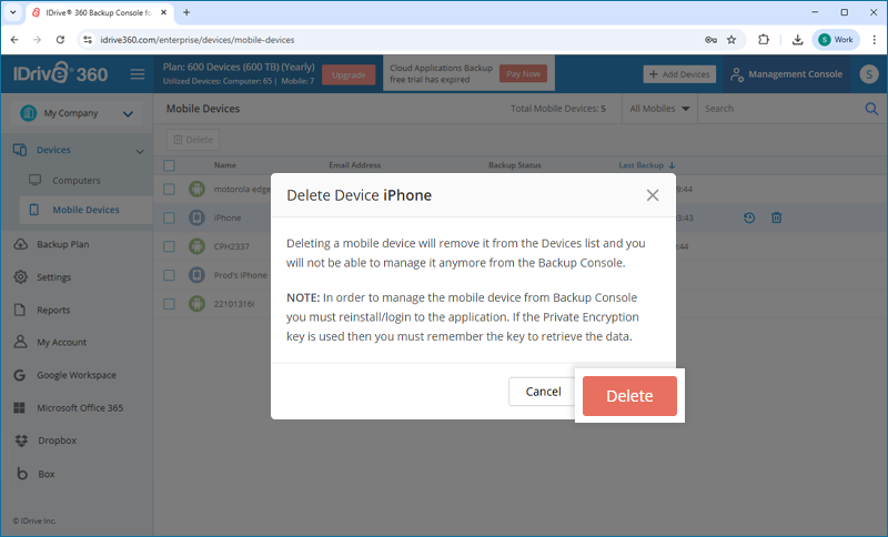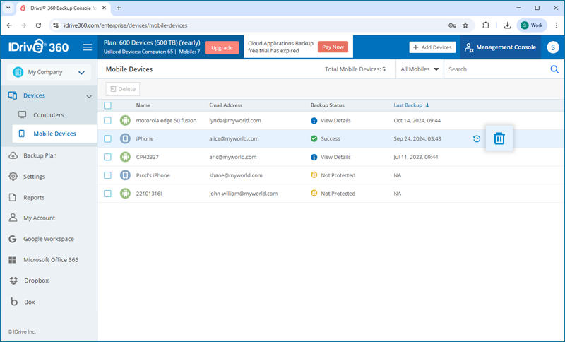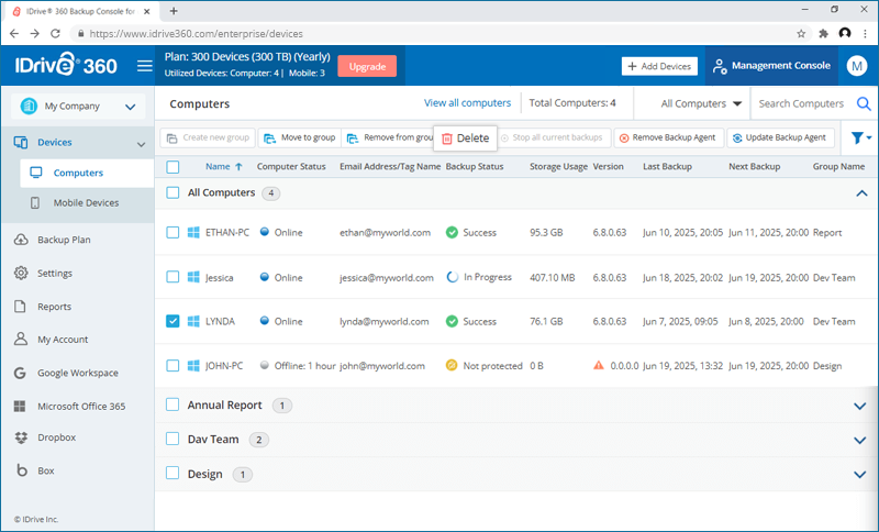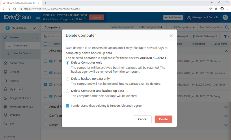 The 'Periodic Cleanup' feature lets you make a one-to-one match of the local data in the backup set, with the same in your cloud account. If data is deleted from your computer that has already been backed up, the corresponding data in your IDrive® 360 account would get permanently deleted too.