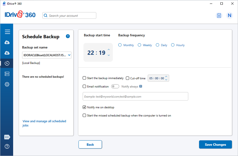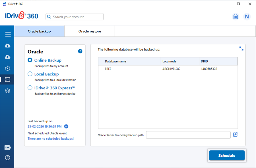 Securely protect your organization's Oracle Server databases with automated, offsite backups and encrypted data transfers. The Oracle backup functionality allows you to capture Oracle 9i/10g database data directly to your IDrive 360 account while the database services remain active, ensuring continuous availability throughout the process.