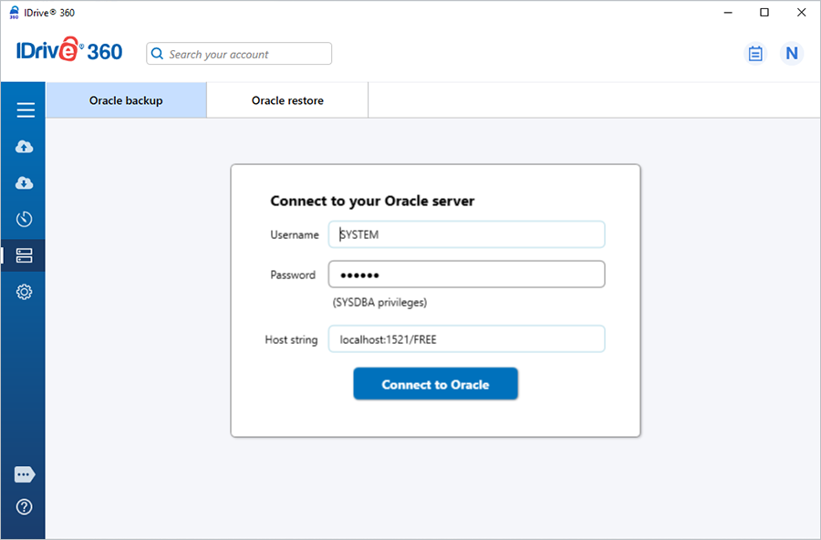- Install the IDrive 360 desktop application on the machine hosting the Oracle Server 9i/10g instance or client.