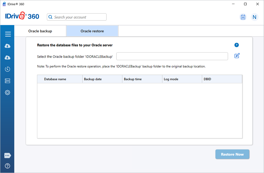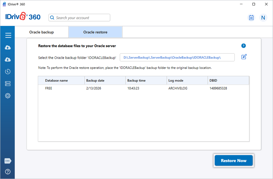 Fast and reliable Oracle database restore helps maintain business continuity during data loss or system outages. IDrive 360 supports smooth and efficient recovery of Oracle databases directly from your IDrive 360 account.