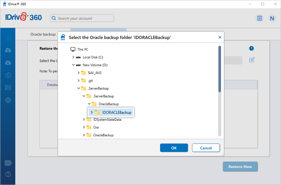 - Browse to and choose the 'IDOracleBackup' folder from your IDrive 360 account or local storage.