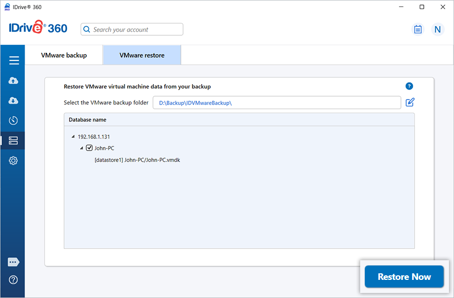 - Click 'Restore Now' to transfer the 'IDVMwareBackup' folder to your local system.