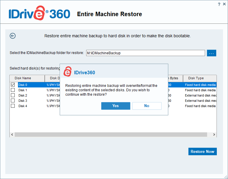 Un mensaje de confirmación advertirá que la restauración de la máquina sobrescribirá todos los datos en la unidad seleccionada. Haga clic en Sí para continuar.
