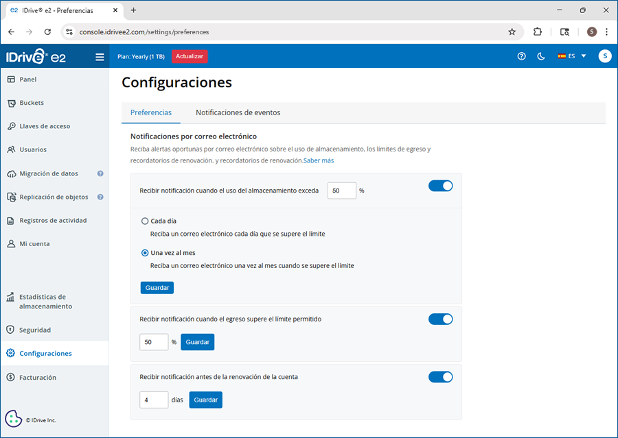 Sí, puedes configurar notificaciones por correo electrónico para recibir alertas cuando el uso de almacenamiento o egreso supere un límite especificado. Además, también puedes recibir recordatorios por correo electrónico para la renovación de la cuenta.