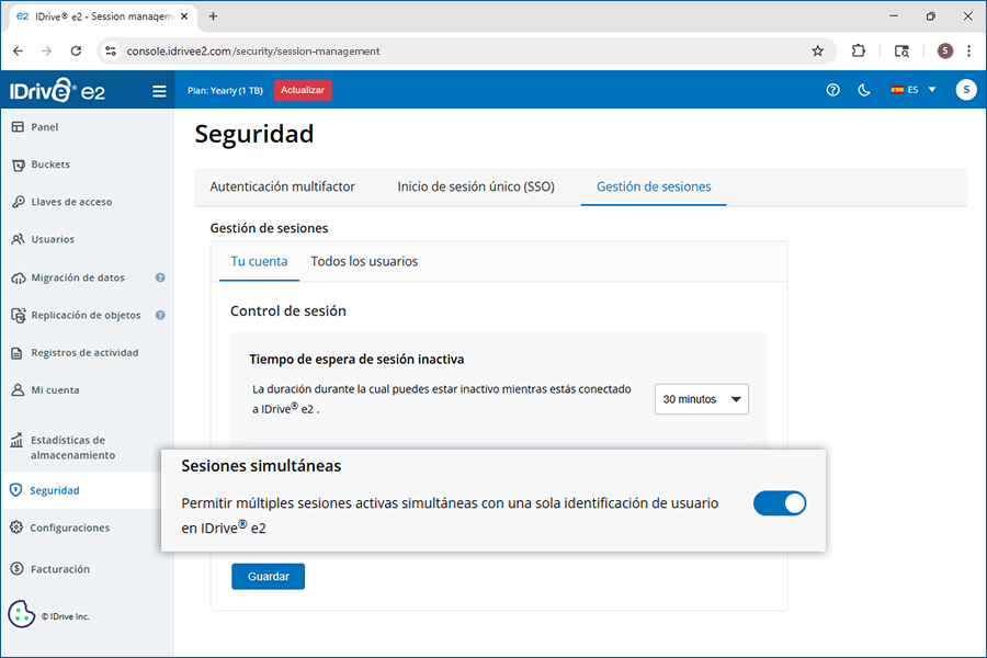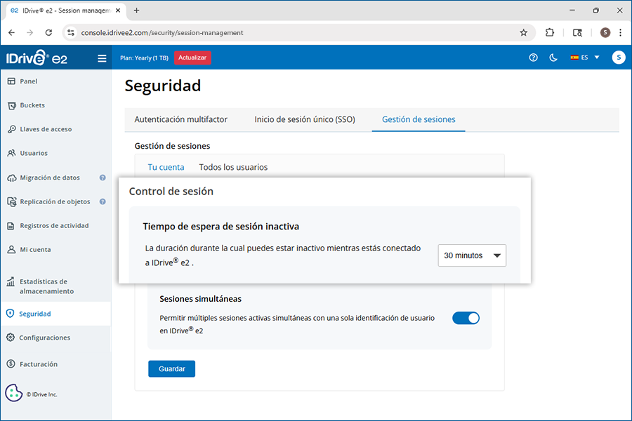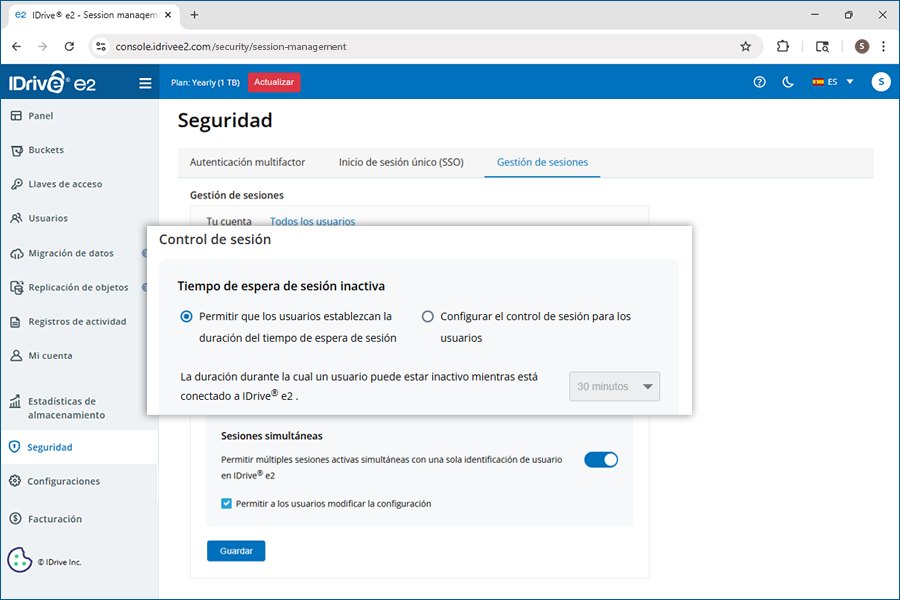 Sí, puedes establecer un tiempo de espera para sesiones inactivas para forzar el cierre de sesión automático de IDrive® e2 si los usuarios están inactivos durante el tiempo especificado.