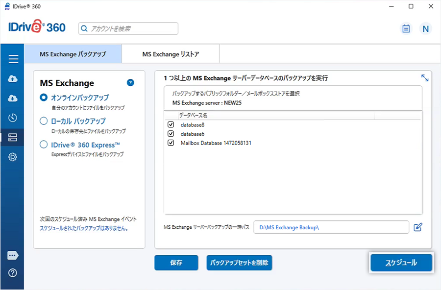 Exchange Server クラスタ接続時は、クラスタ内のすべてのデータベースが表示されます。 - 「今すぐスケジュール」をクリック。
