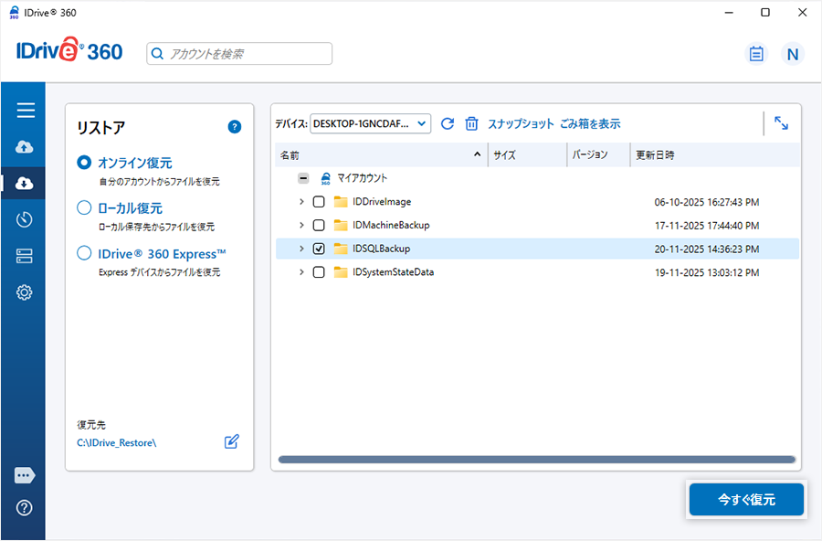 - 「オンラインリストア」「ローカルリストア」または「IDrive® 360 Express™」を選択します。