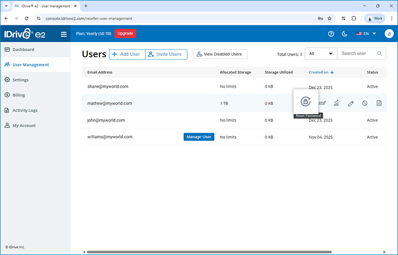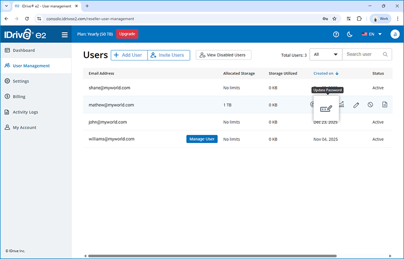 The user will receive a link in email to create IDrive® e2 account. All users will be listed under the 'User Management' tab.