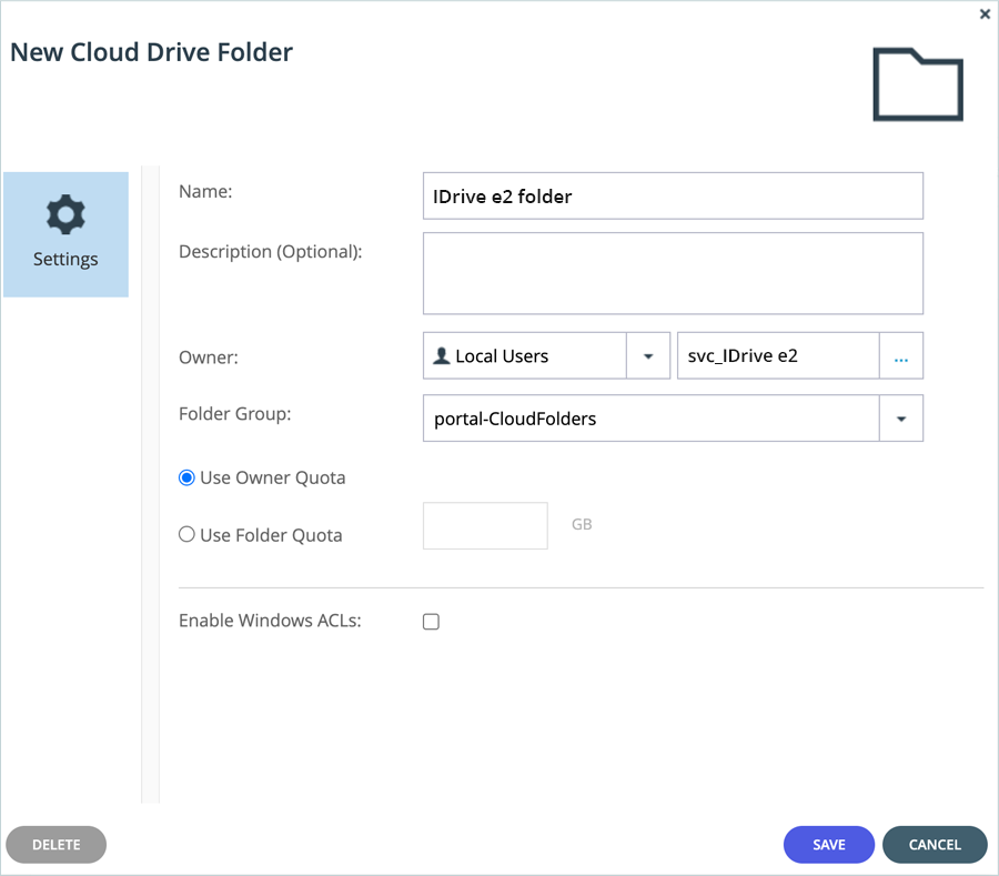 - Under Cloud Drive Folders, click + New Folder and provide the following details.