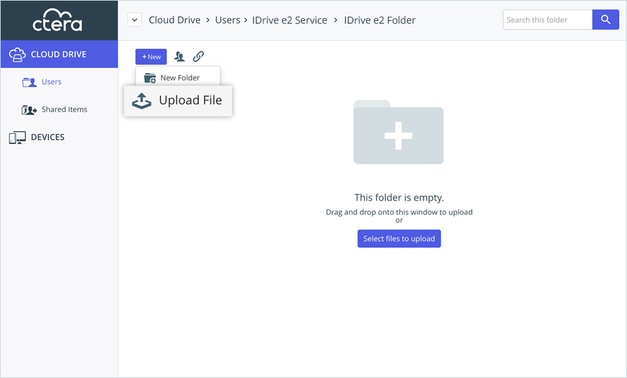 Note: In the CTERA portal, you can upload, download, and delete objects that belong to the IDrive® e2 bucket.