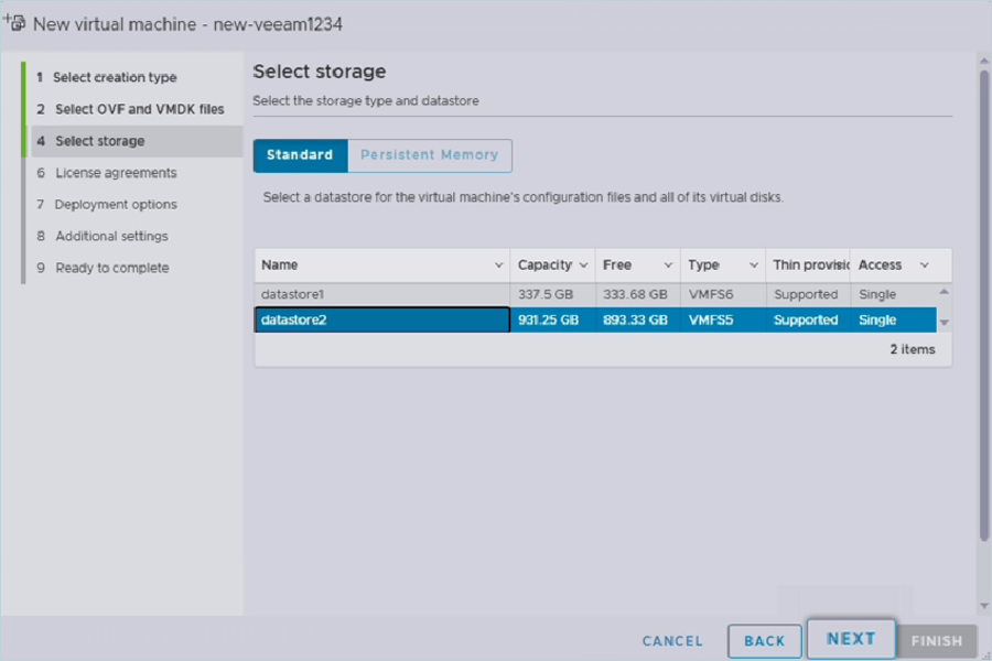 - Select a datastore with sufficient space (two virtual disks, 240 GB each).