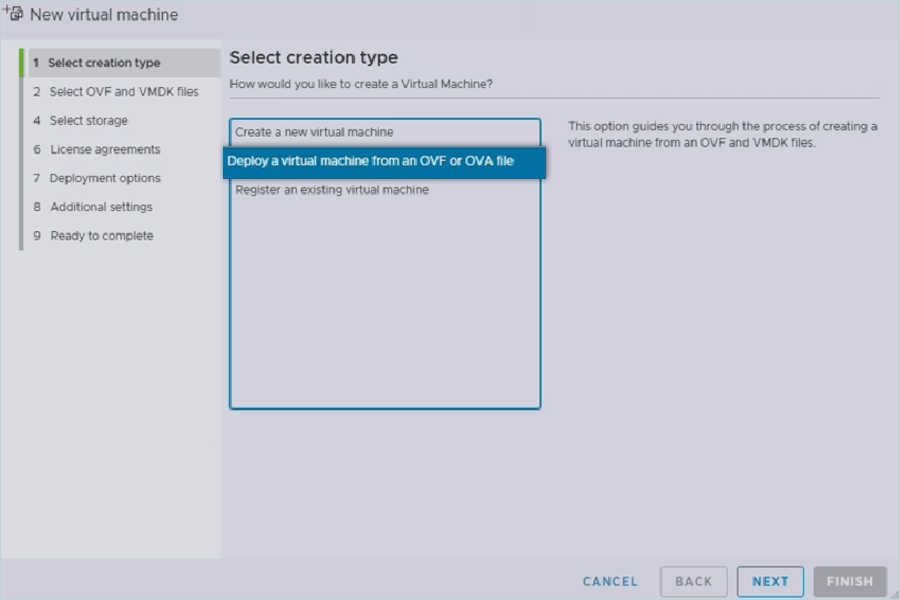 - Select Deploy a virtual machine from an OVF or OVA file.