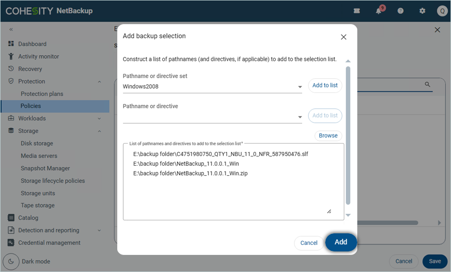 - In the Add Backup selection window,