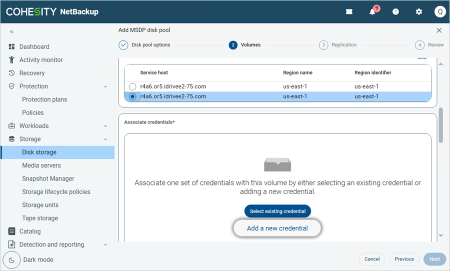 - Click Add a new credential under Associate credentials and enter your IDrive® e2 details as mentioned.
