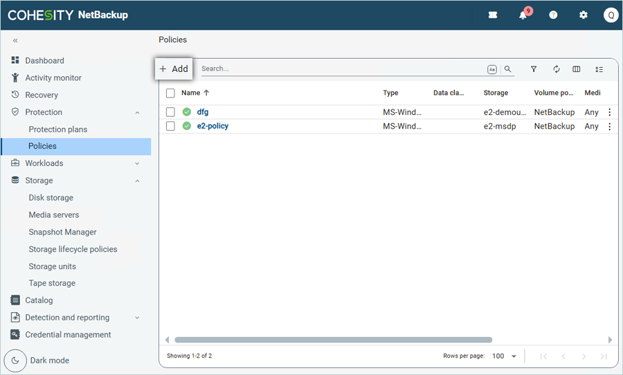 - Click Add to add a new policy in the Policies tab.