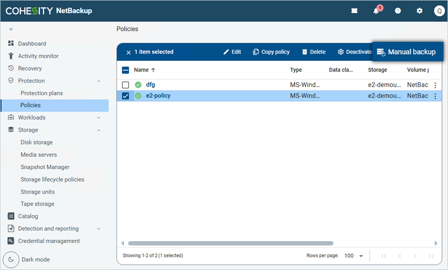 - Select the added policy by checking and clicking on Manual Backup in the top-right corner.