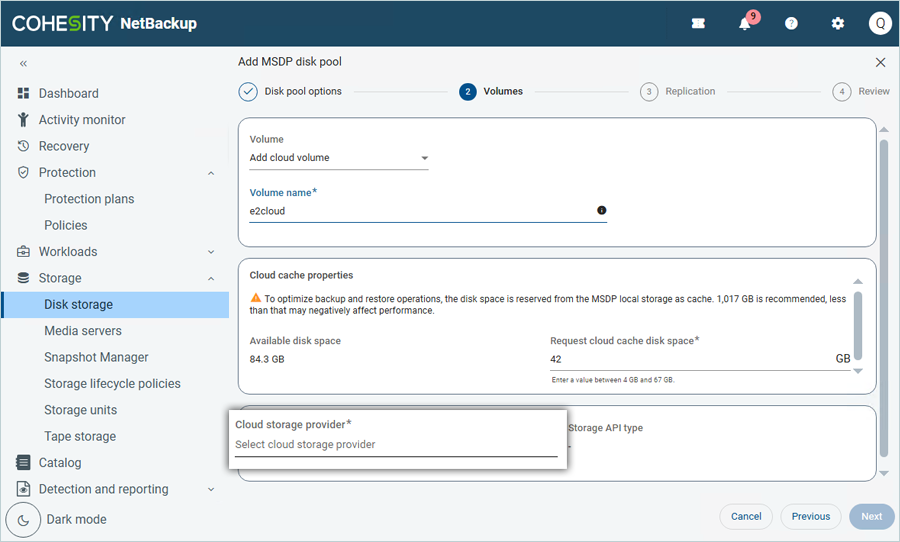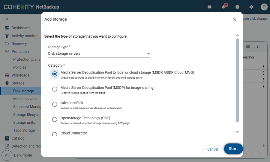 - In the Add Storage window, select Disk storage servers as the Storage Type. Select Media Server Deduplication (MSDP Cloud) as the Category and click Start.