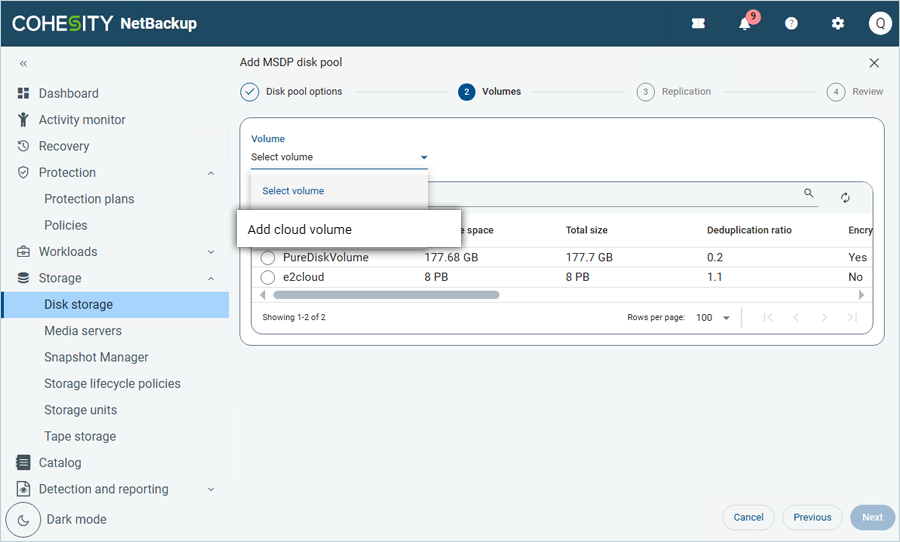 - In Volumes, click Select volume and then select Add cloud volume.