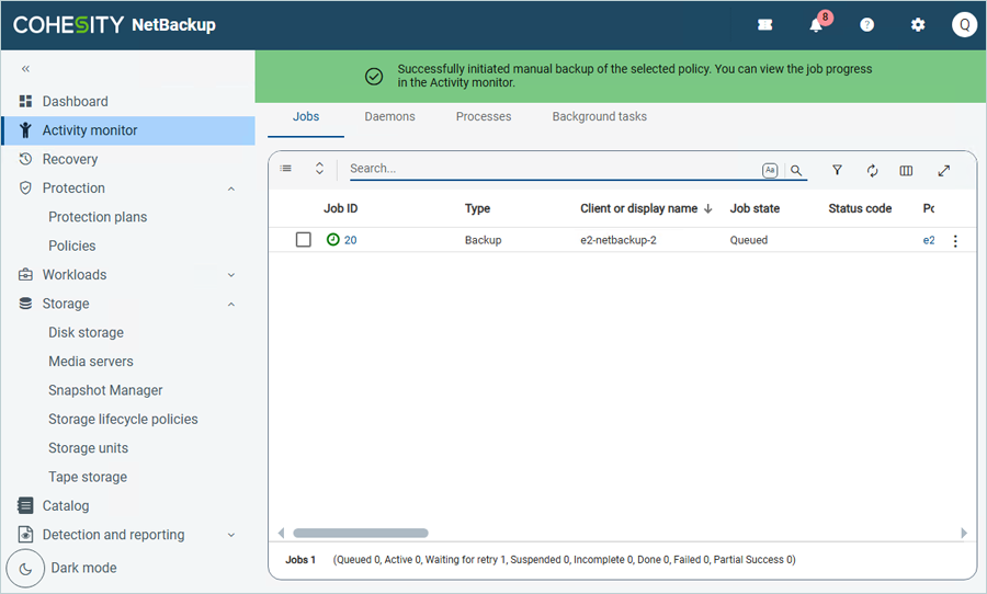 The backup has now started. Click Activity Monitor to observe the progress and status of the backup job.