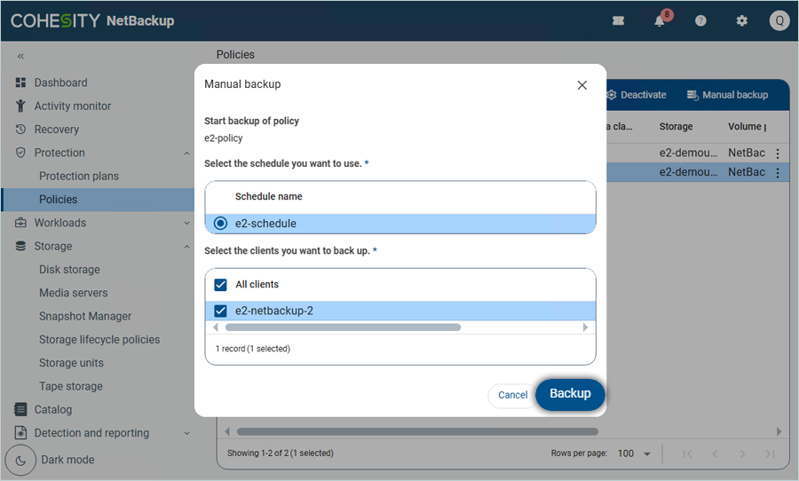 - Select both the Schedule name and the clients you want to back up, and then click Backup.