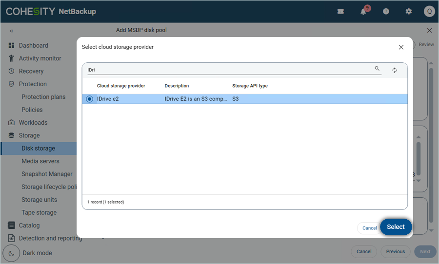 - Select IDrive® e2 as the provider and click Select.