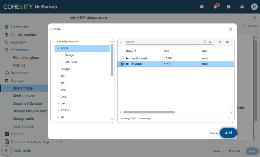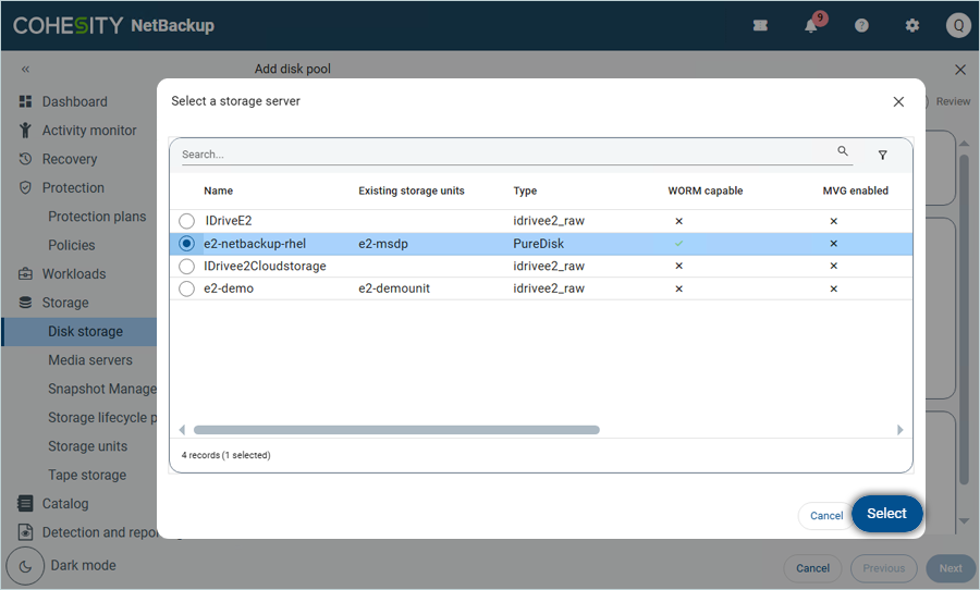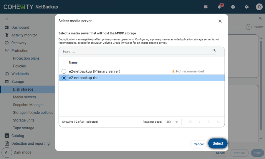- Select your e2 MSDP storage server from the list and click Select (Created in the previous step).
