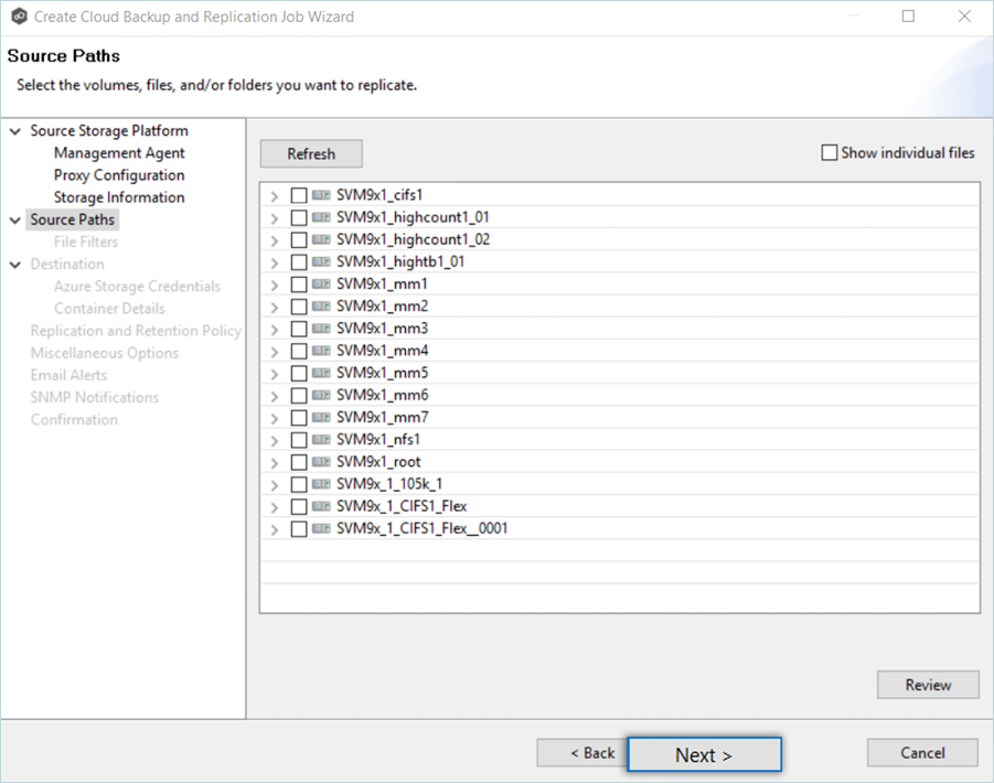 - Select the paths to the files/folders/volumes you want to replicate. Click Review to review your selections, and then click Next.