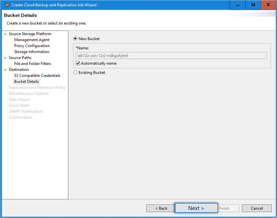 - In the Bucket Details window, select an existing bucket or create a new one by entering a name. Then click Next.