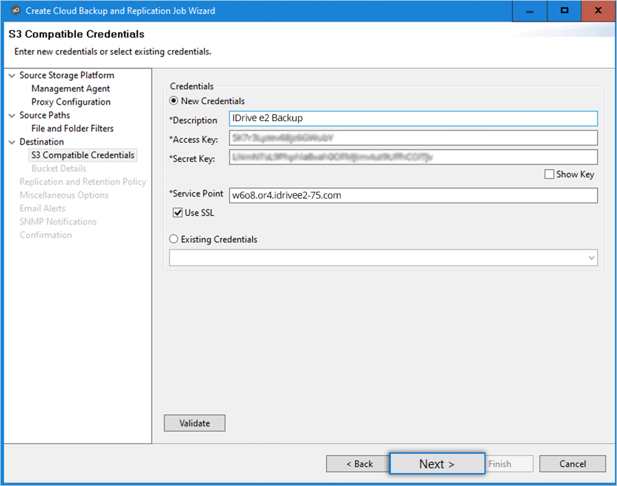 - On the Destination page, select S3 Compatible as the destination and click Next.