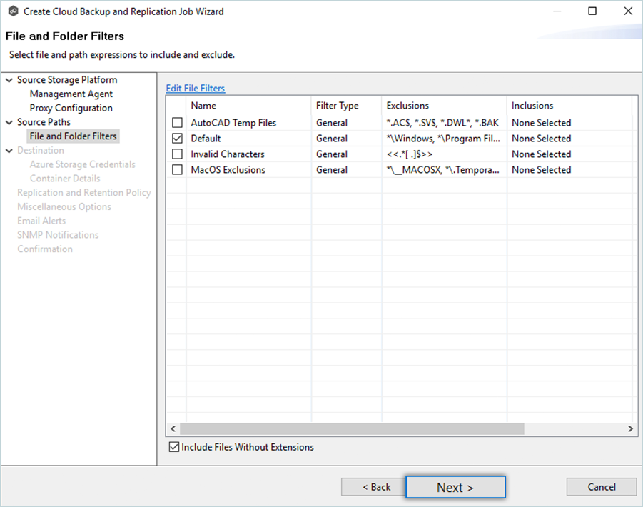 - Select the file and folder filters you want to apply to the job. Select the Include Files Without Extensions checkbox if you want to replicate files that do not have extensions. Click Next to continue.