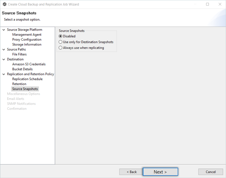 - Select the Use only for Destination Snapshots option when you want the source snapshot to be stored on the destination storage as the destination snapshot rather than an actual destination snapshot.
