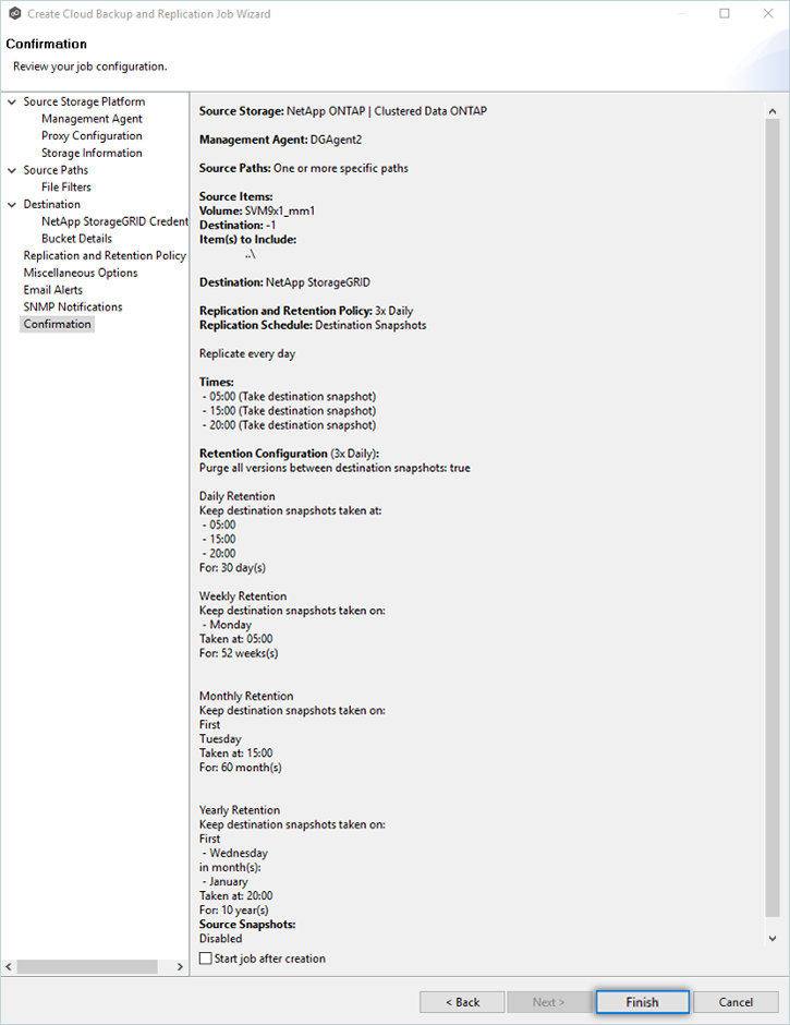 - Review the job configuration on the Confirmation page and select the Start job after creation checkbox. Then click Finish.