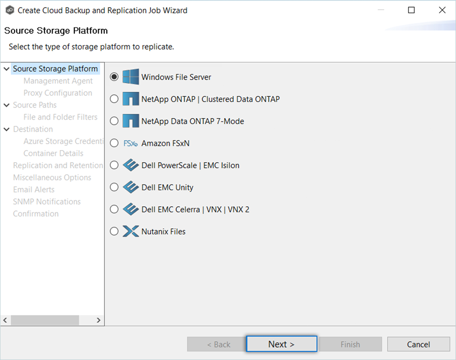 - On the Source Storage Platform page, select the type of storage platform you want to back up or replicate. Click Next to continue.
