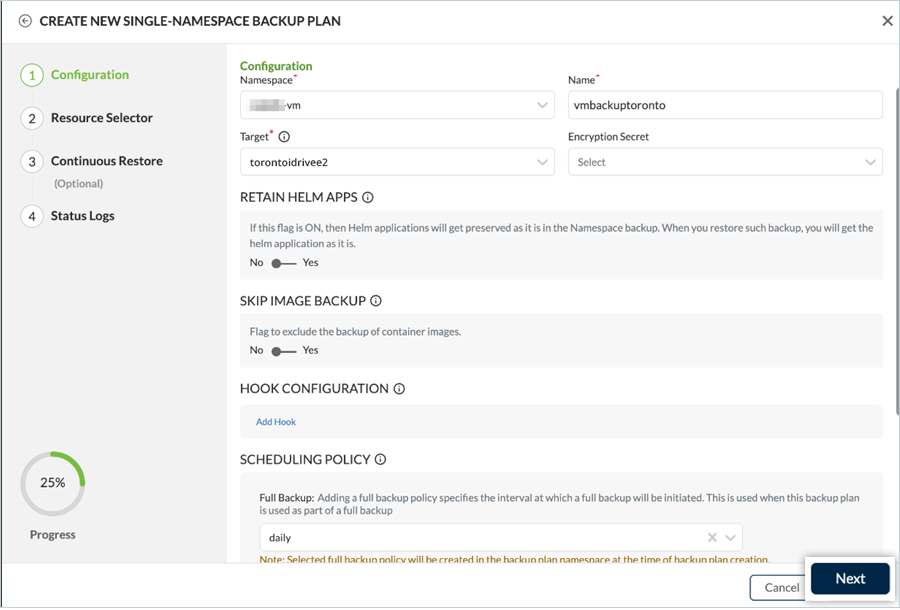 - Select the namespace to protect, provide a Name for the backup plan, and choose the previously created IDrive® e2 target as the Target. Under Scheduling Policy, set the required backup frequency for your organization, then click Next.