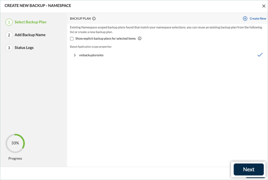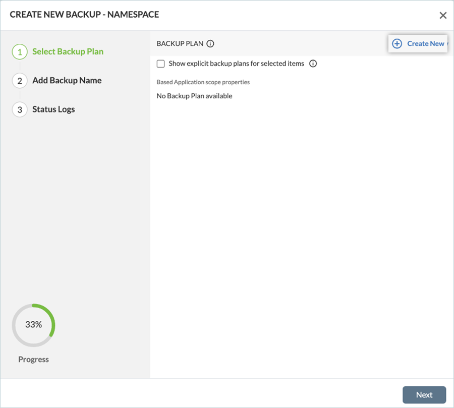 - Click Create Backup, under NAMESPACES, to start the wizard.