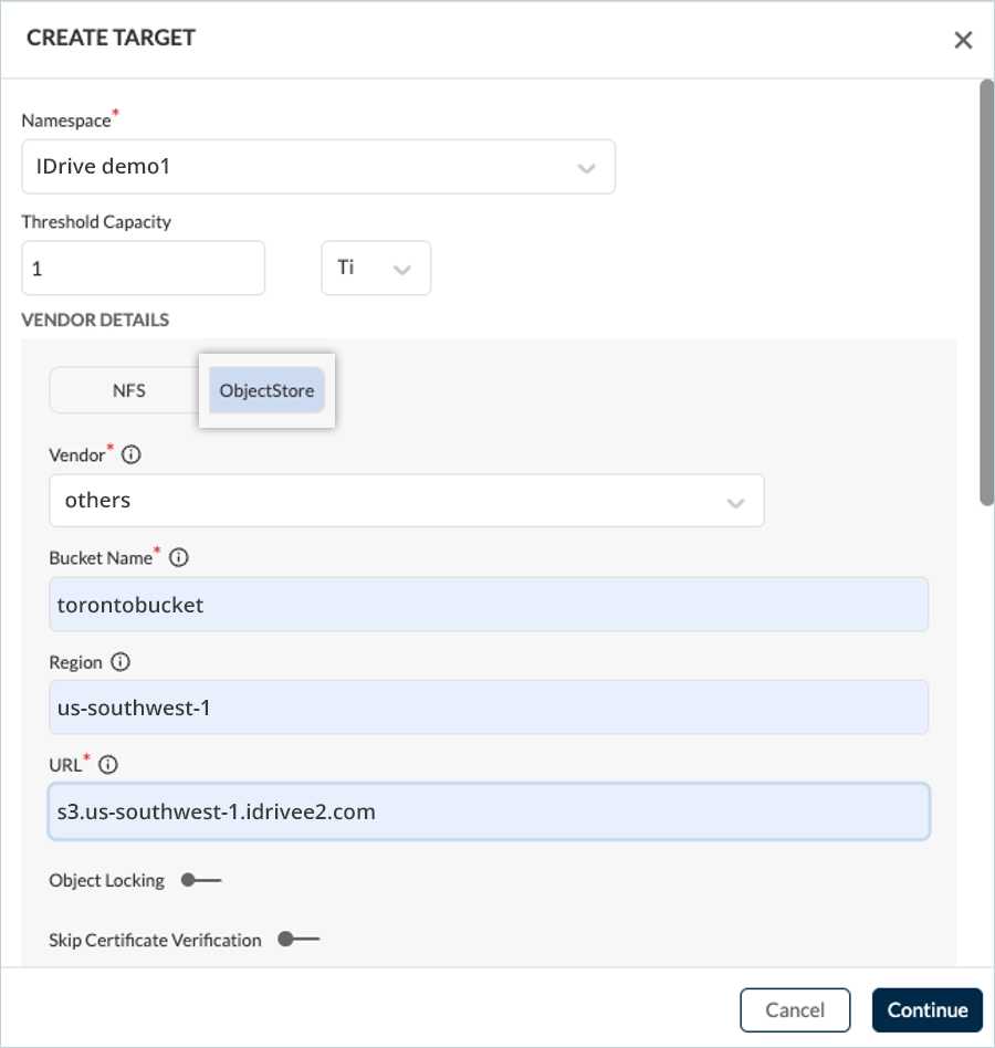 Note: Do not enable Object Locking, as Trilio does not currently support managing object lifecycle policies when this feature is active.